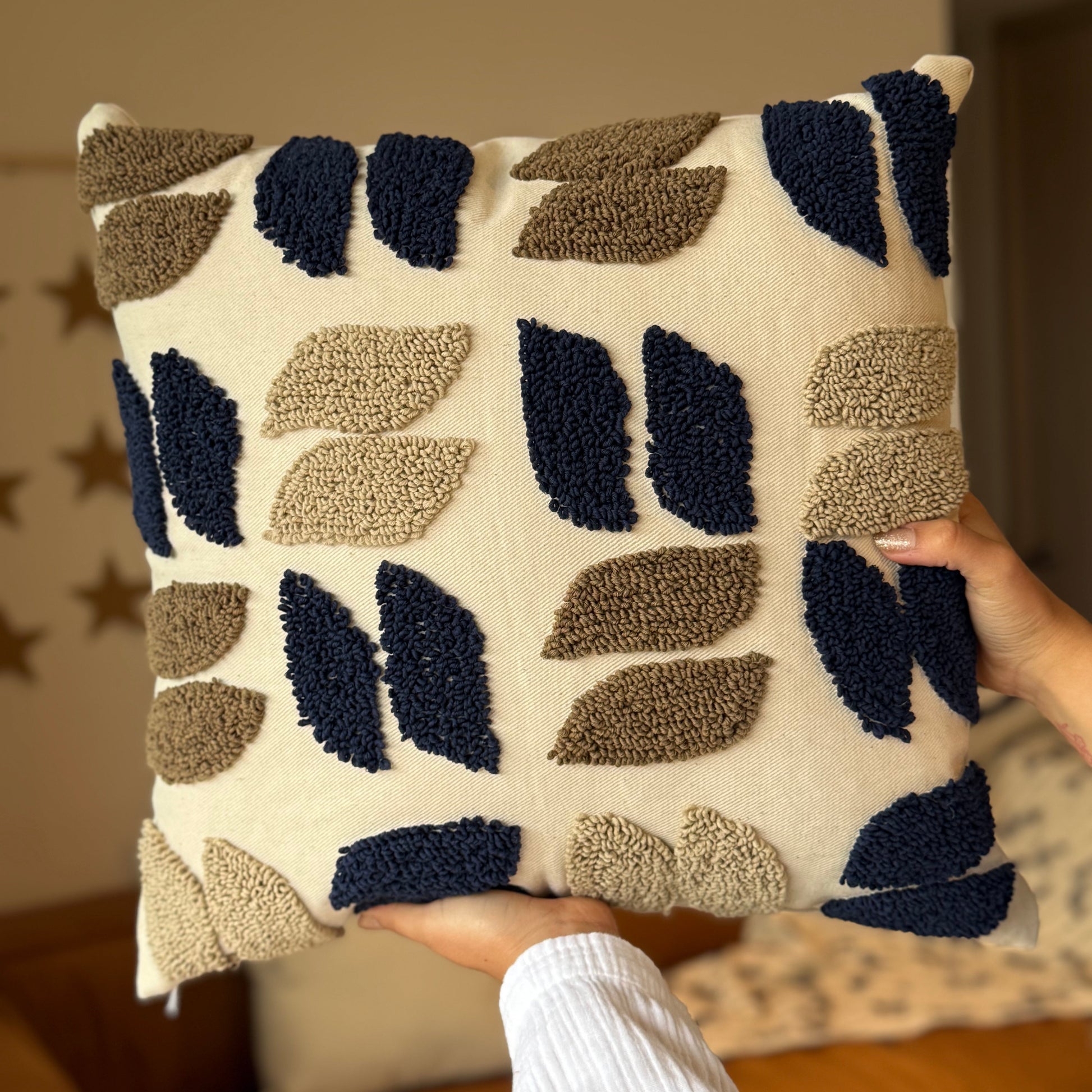 Añade un toque artesanal a tu hogar con este cojín de algodón bordado a mano. Su diseño de ovejas y su color lo hacen perfecto para cualquier espacio. Incluye relleno